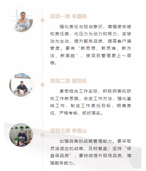 為提升公司管理服務(wù)水平,促進(jìn)各項(xiàng)目工作順利開(kāi)展,各分管領(lǐng)導(dǎo)基本上都是首先傳達(dá)“公司2021年終工作總結(jié)及2022年規(guī)劃會(huì)議精神”,核心謹(jǐn)記林董“管好人,理好事”六字精髓;貫徹落實(shí)江總的五項(xiàng)運(yùn)營(yíng)要點(diǎn)。