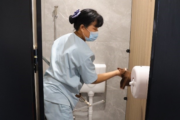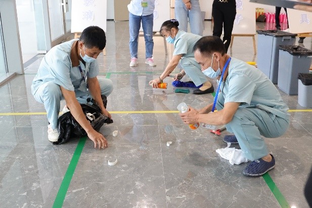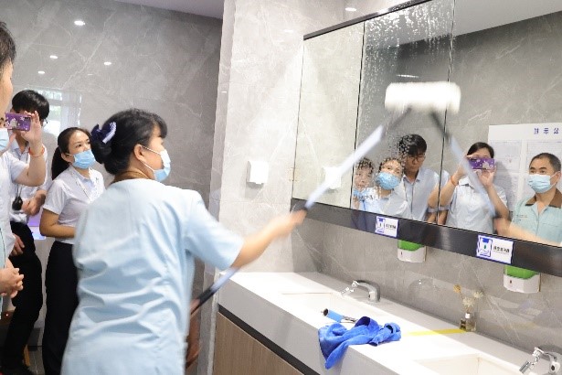 本次競(jìng)賽著重考核保潔員綜合作業(yè)水平,通過(guò)抽簽決定參賽選手參賽順序;比武項(xiàng)目分為“選工具”、“套袋子”、“除膠印”、“刮玻璃”、及“潔臺(tái)盆”及“清潔衛(wèi)生間”六個(gè)部分。賽前,業(yè)安對(duì)保潔操作流程、質(zhì)量標(biāo)準(zhǔn)及考核細(xì)則等進(jìn)行細(xì)致講解及培訓(xùn),重點(diǎn)考核實(shí)操的規(guī)范性與清潔的質(zhì)量。